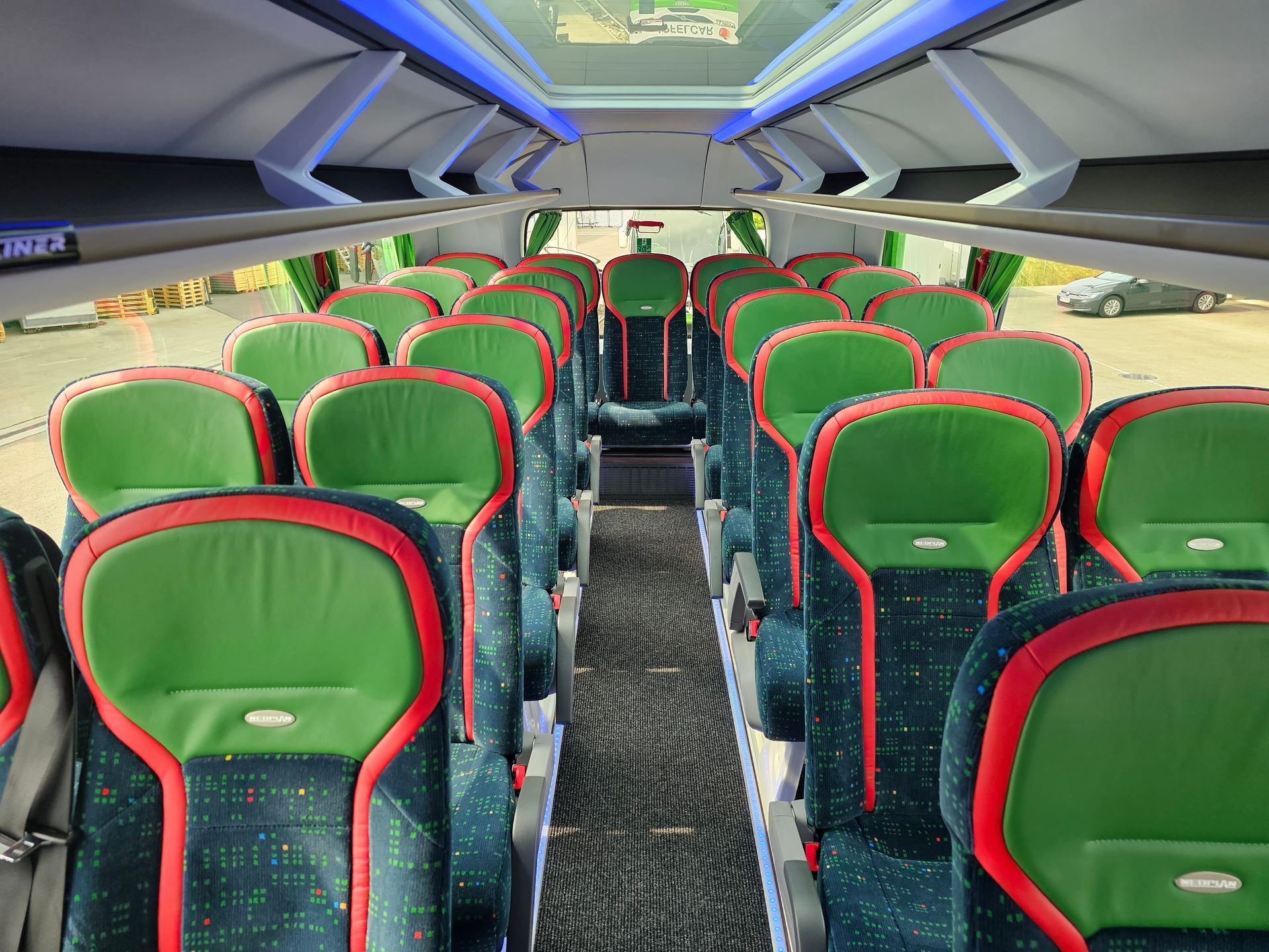- bequeme Fahrgastsitze, Fuss- und Armstützen, Klapptische
